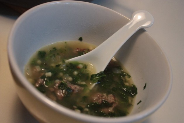 At home we call this Meatball Soup but it doesn’t really have meatballs in it. What it does have is fresh pork sausage fried with onions and then it’s combined with stock, pasta and spinach. I started making this because my kids loved the canned Italian wedding soup. I was looking for a cheaper and more plentiful version of it to make at home – one can of soup looks very small when you’re trying to feed a family of hungry boys 🙂