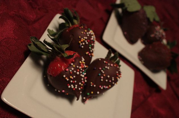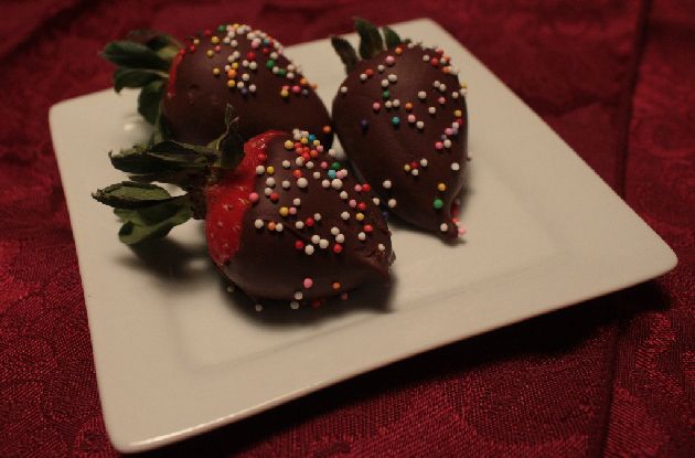 3. If using sprinkles, sprinkle them on the chocolate strawberry before the chocolate hardens.