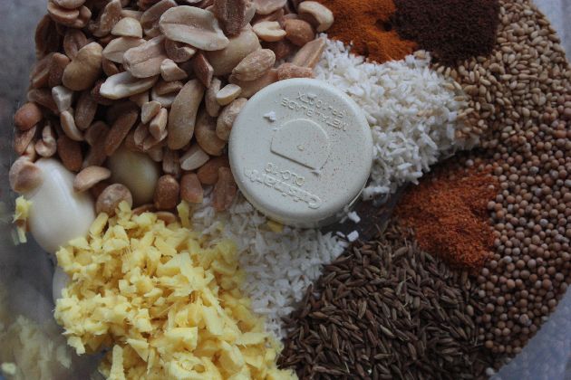 Here are all my seeds, nuts, spices, ginger and garlic happily waiting in the food processor to be ground up into a delicious savory curry paste.